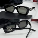 Statement Gentle Monster sunglasses in gloss black acetate with a softly rectangular, slightly scaled‑up lens shape and grey tint. The standout is the *silver‑tone temple plaque inset with crystals and a central jewel* (mirror‑shield look), three‑dot accent at the hinge, and “GENTLE MONSTER” printed along the temple. Inner temple stamps brand details; the fit is structured but not heavy. Comes with Gentle Monster case and cloth.