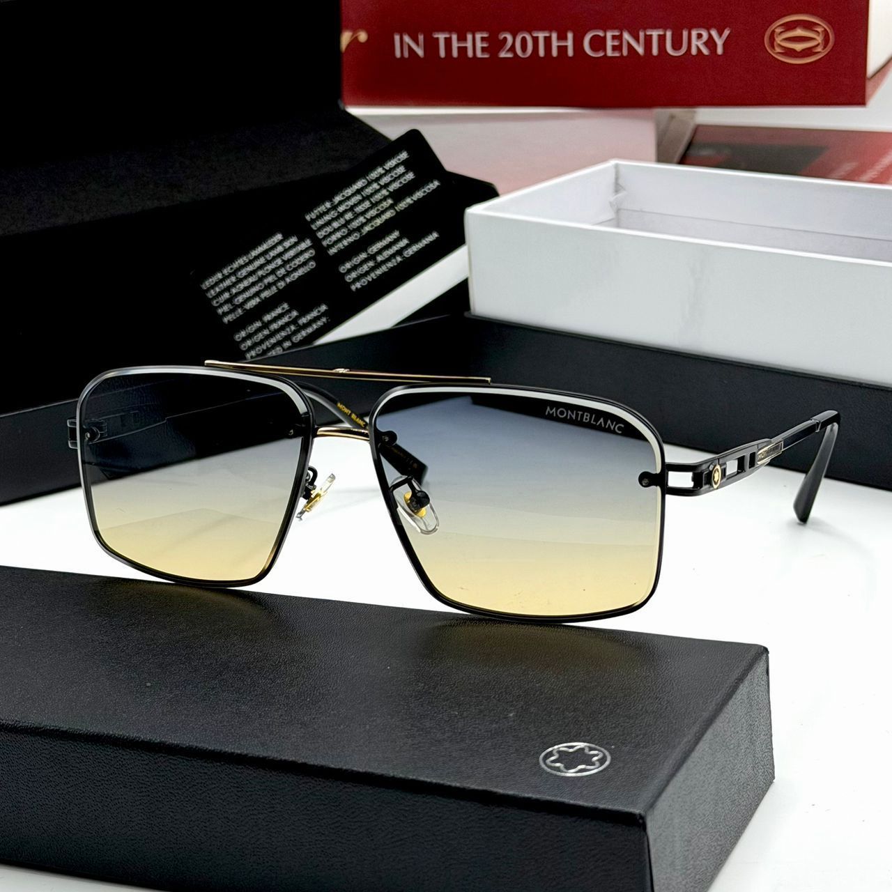Metal navigator frames with a black‑and‑gold double‑bar bridge, rectangular lenses with a grey‑to‑yellow gradient, and adjustable nose pads. The temples have the Montblanc emblem at the hinge and brand scripting inside. Comes in Montblanc case and box.